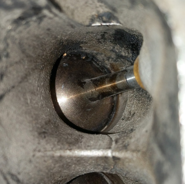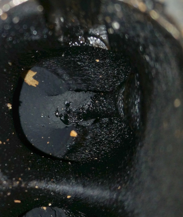 Inlet tract and valve stem with significant deposits – some bits of walnut shell visible.
